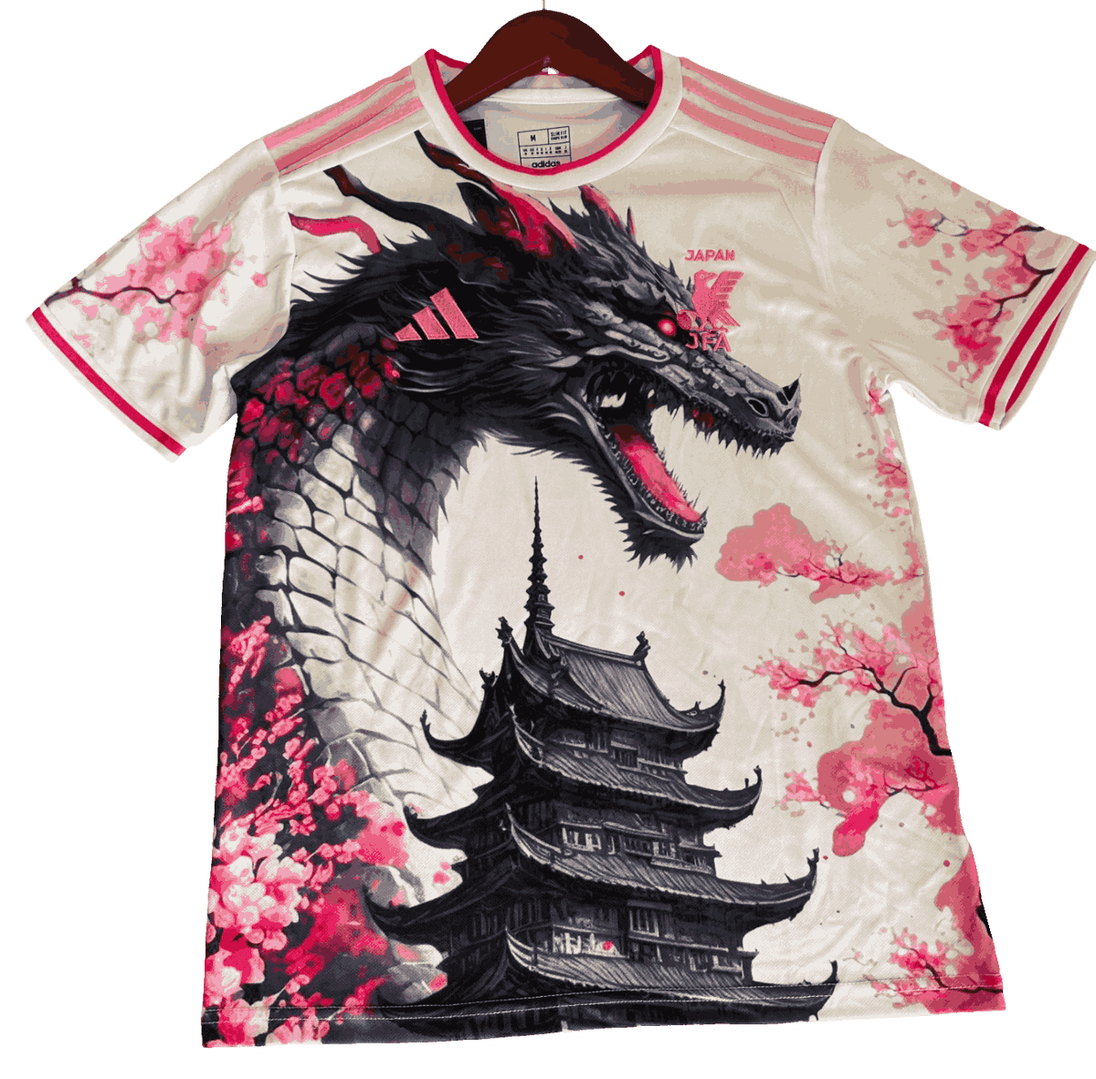 Innovation maillot concept japon dragon explore mono no aware sensibilité mélancolique impermanence choses sakura dragon fusion. Blanc immaculé utilise contraste poétique créant profondeur préservant reconnaissance culturelle authentique. Concept mythologique permet supporters accompagner poésie respectueuse authentique tradition japonaise mono no aware.